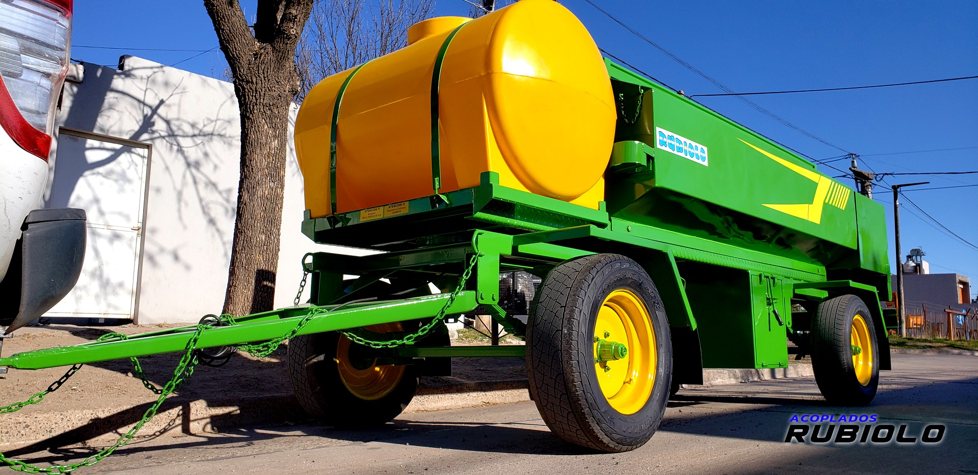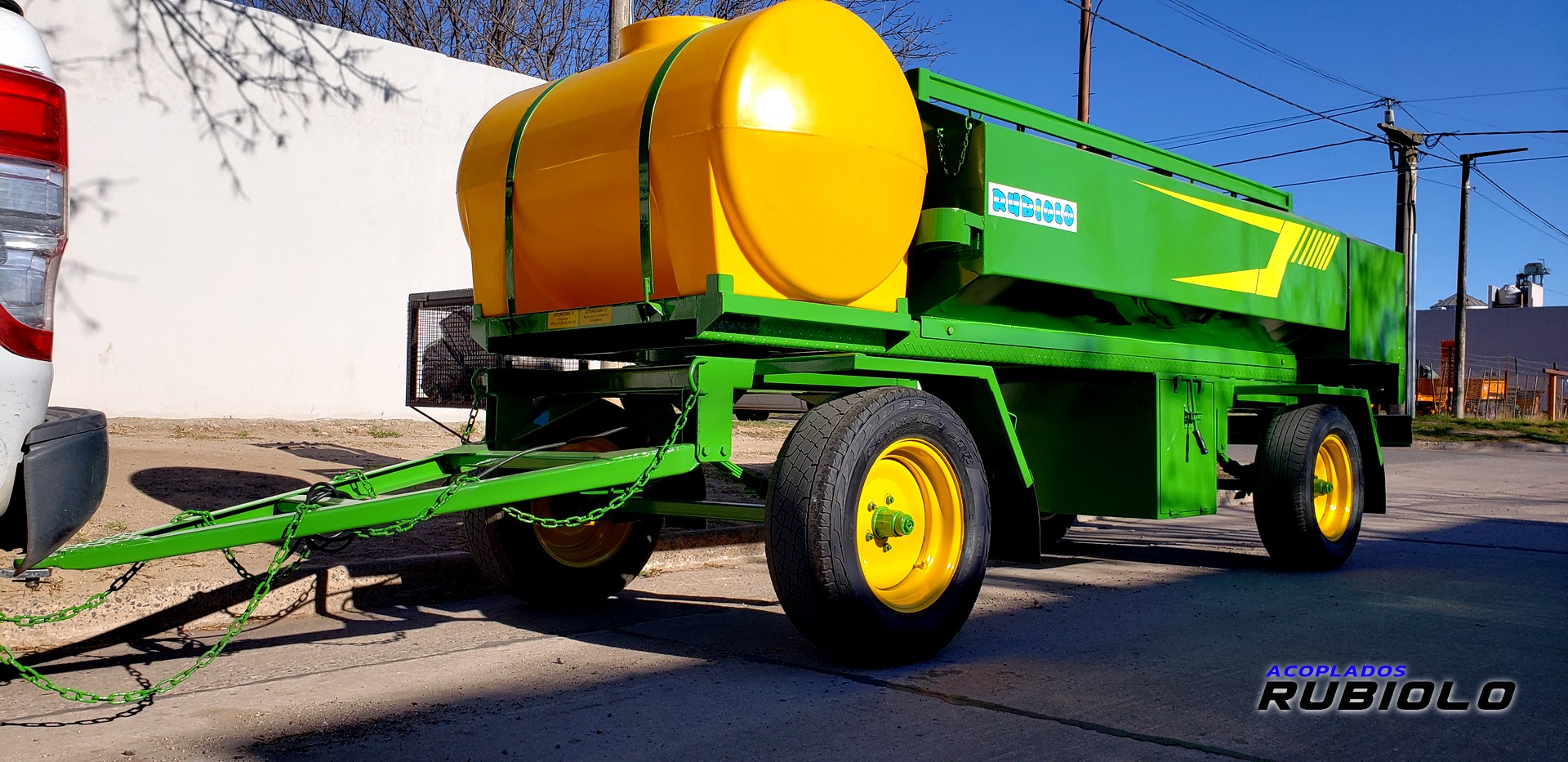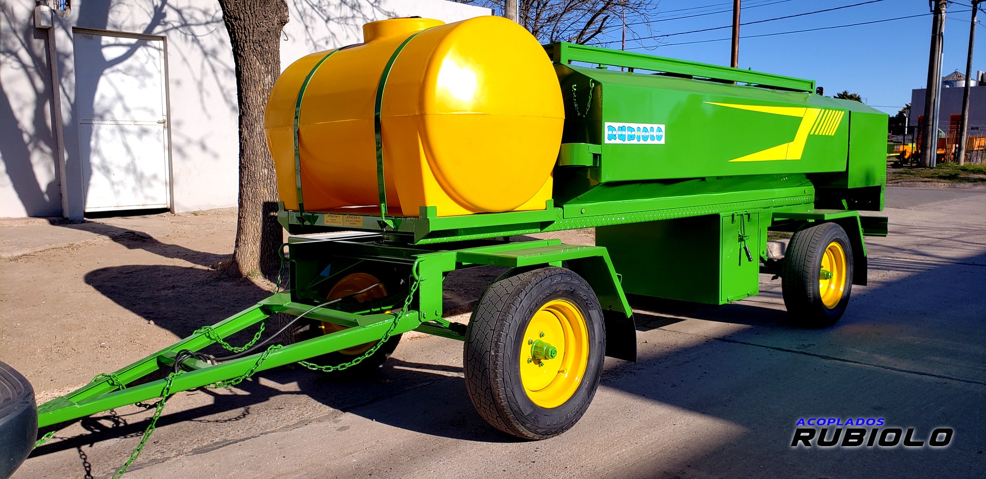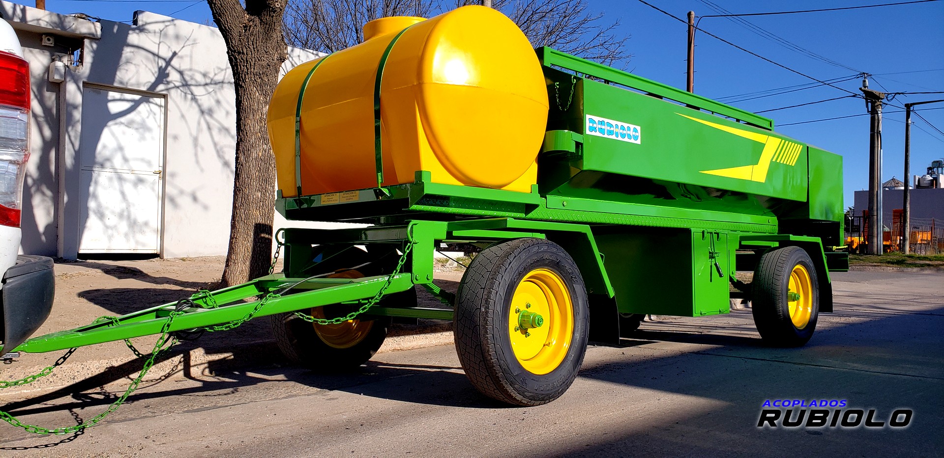 Acoplado de gran capacidad combinada (5.000 Lts. totales), con chasis reforzado y ejes de mayor diámetro, diseñado para el soporte logístico avanzado de combustible y agua.