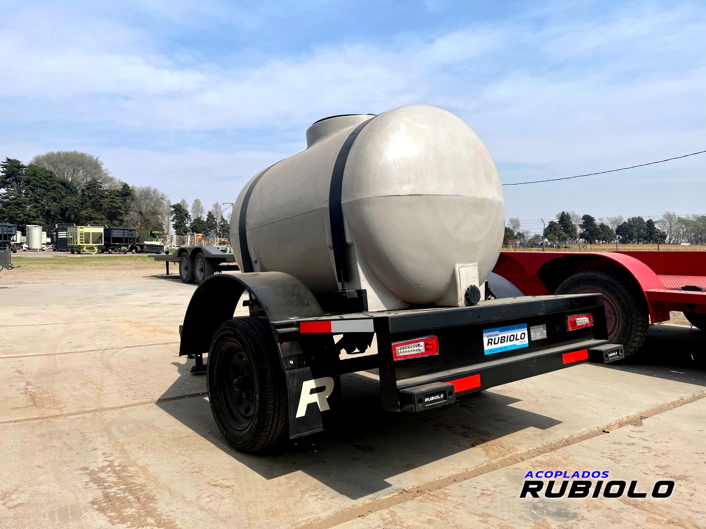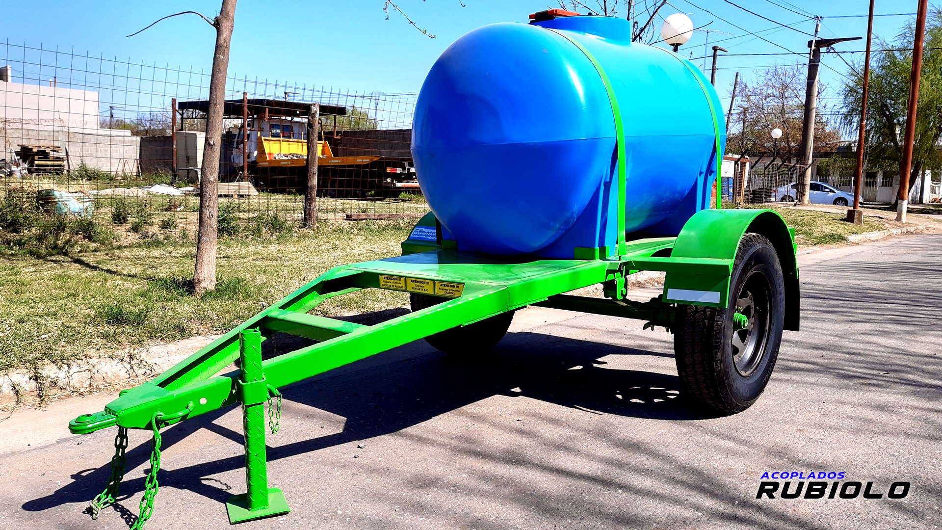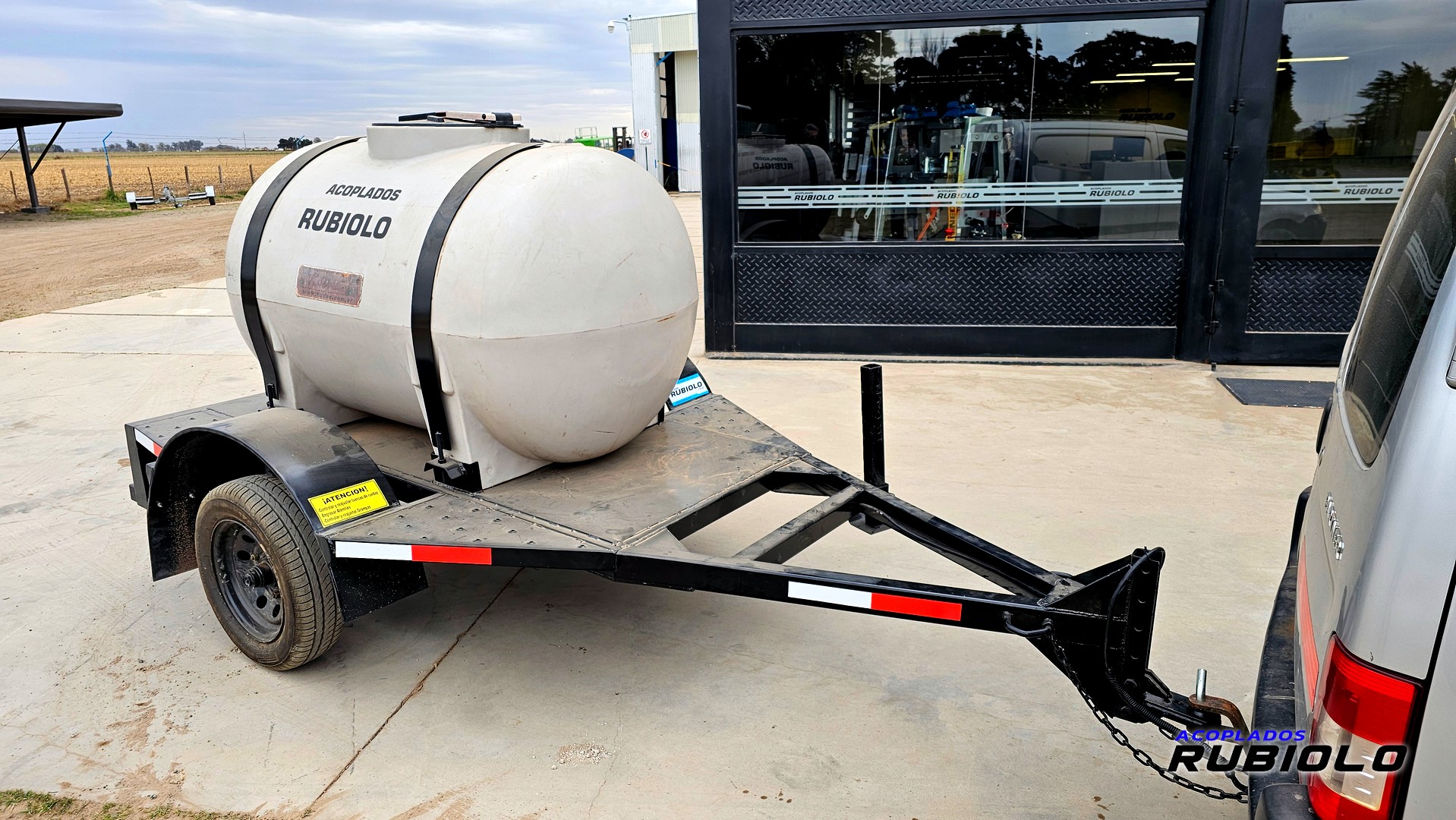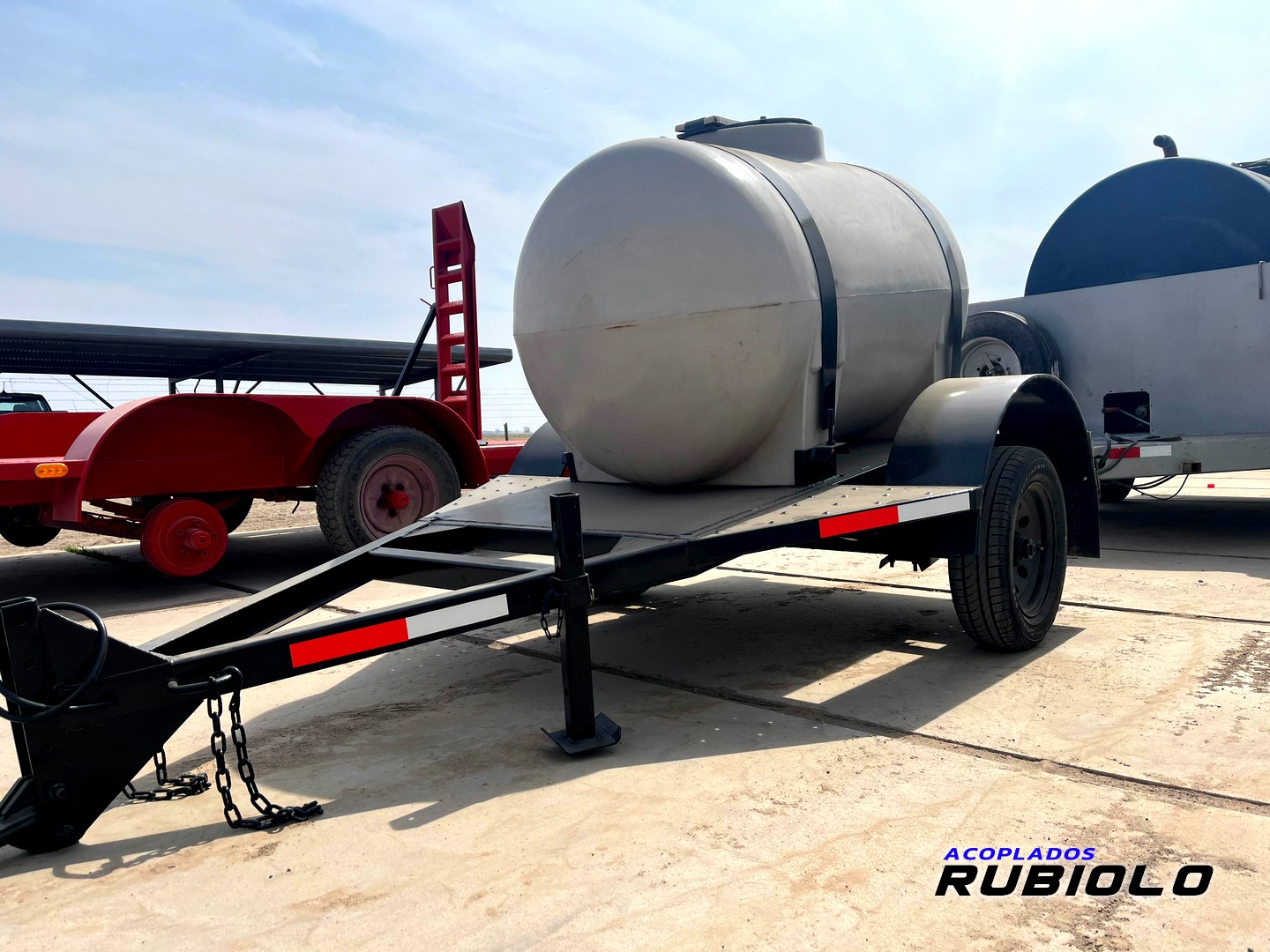 Acoplado tipo batán con tanque de plástico (1.000 Lts.), ideal para el transporte ligero y almacenamiento de diversas sustancias líquidas (agua, fertilizantes, combustibles) y como apoyo a fumigadoras o sistemas de riego.