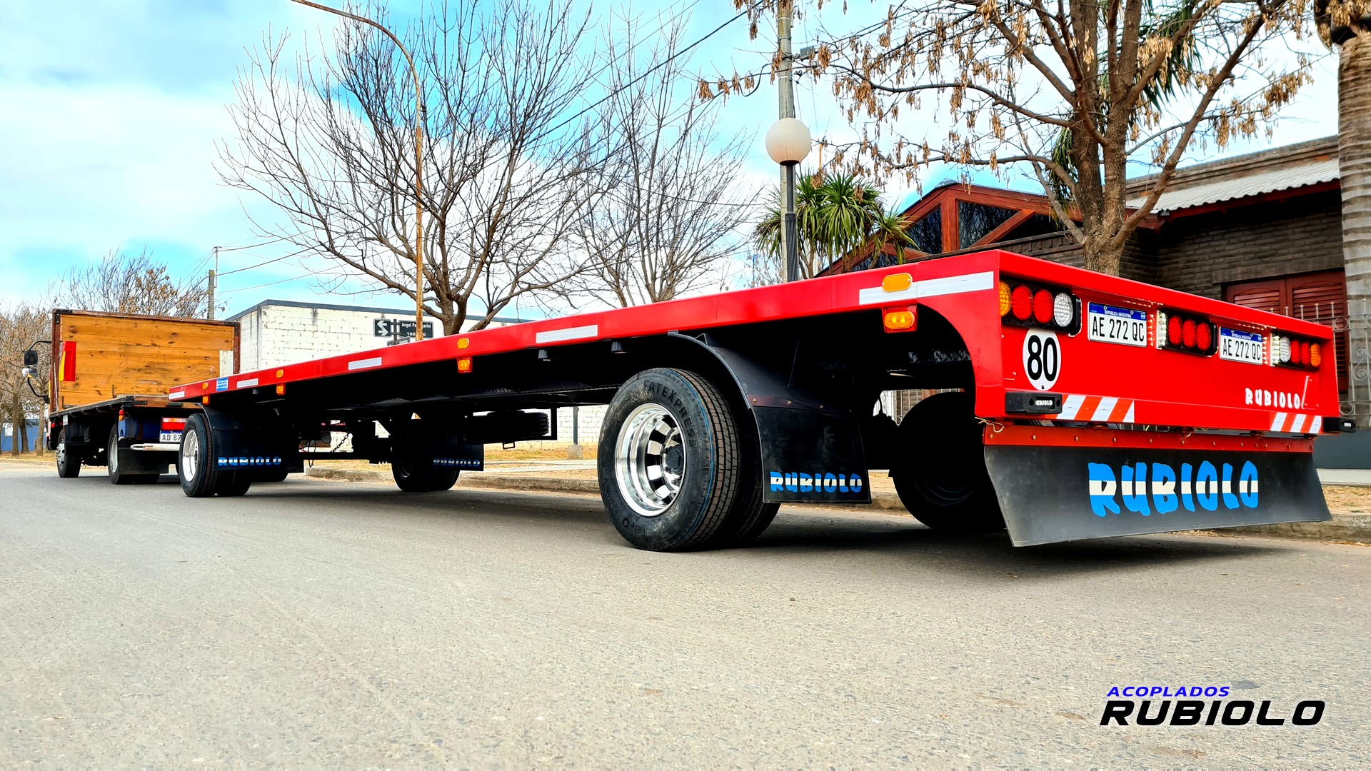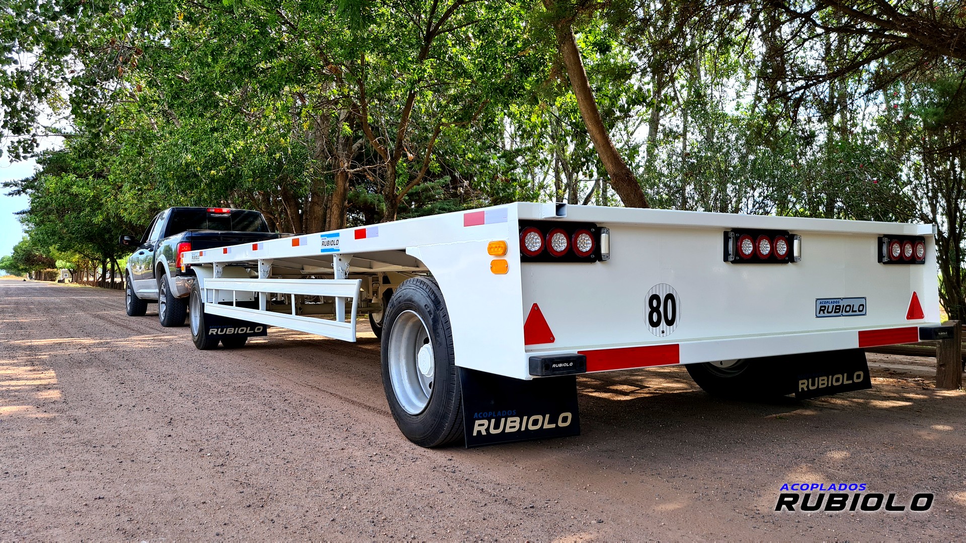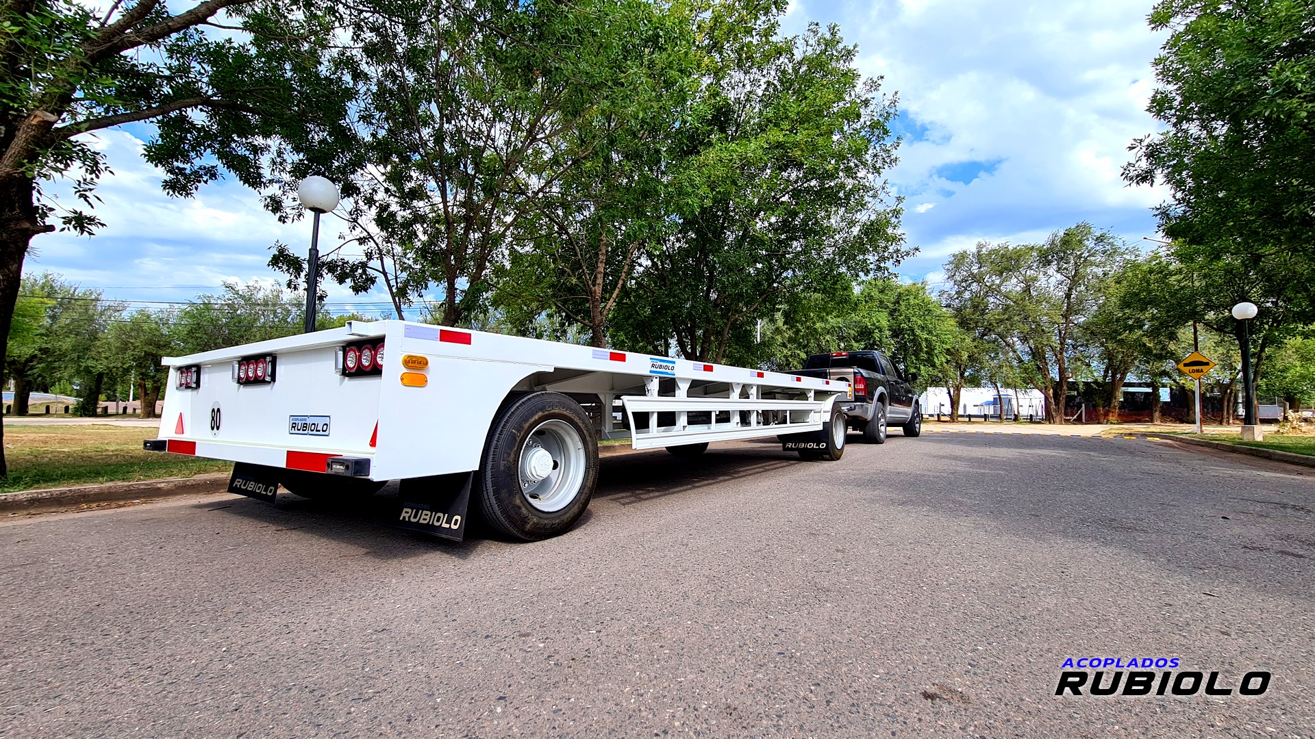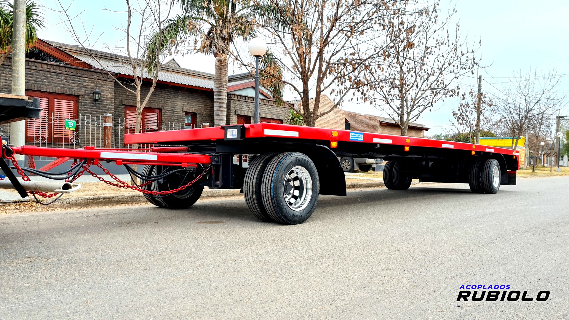 Acoplado de plataforma plana de alta capacidad, Homologado y equipado con ejes tubulares, suspensión reforzada y freno neumático con Springbrake para transporte pesado y seguro.