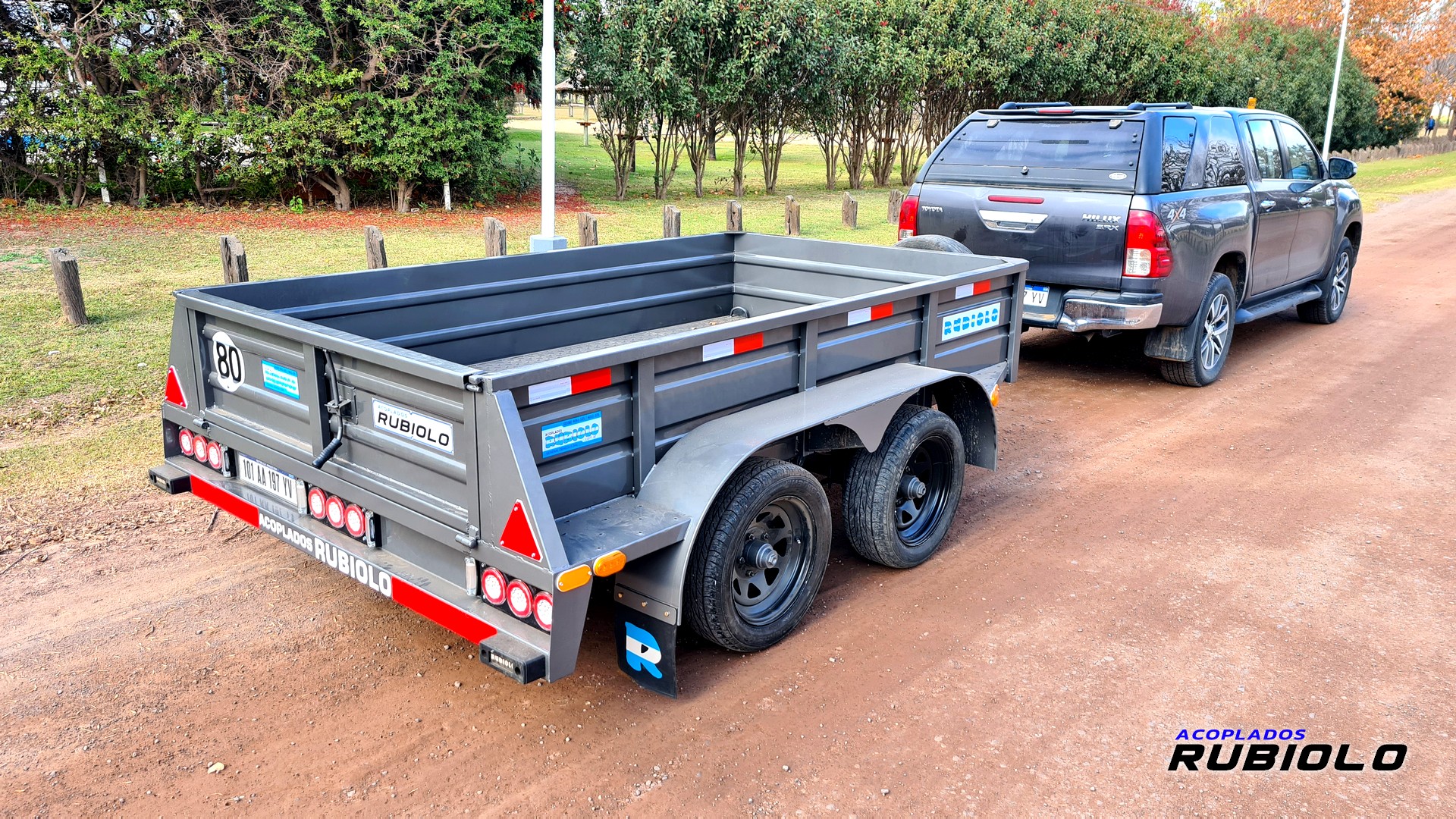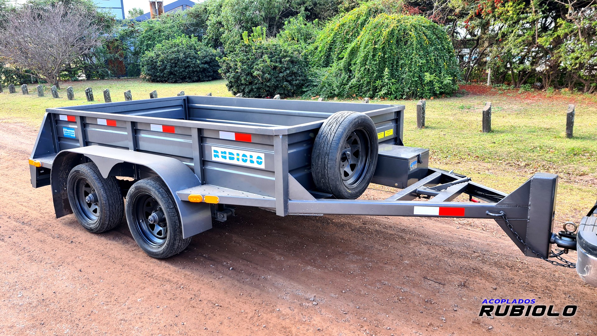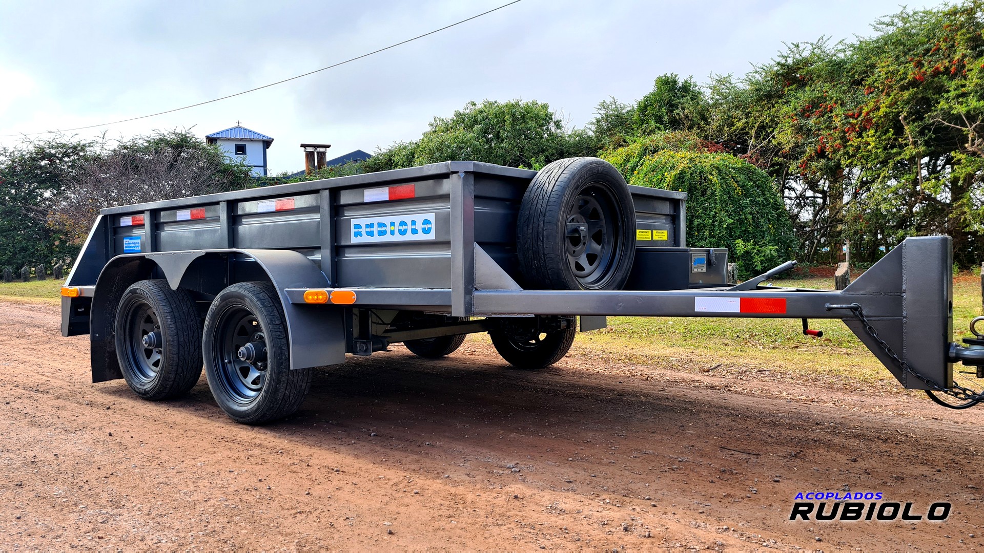 Acoplado de doble eje con sistema Balancín, Homologado para ruta (O2) y diseñado con ruedas al costado (tipo batán). Posee un sistema de freno eléctrico inercial completo y cumple con todas las normativas viales para una capacidad de carga real de 2.8 Tn.