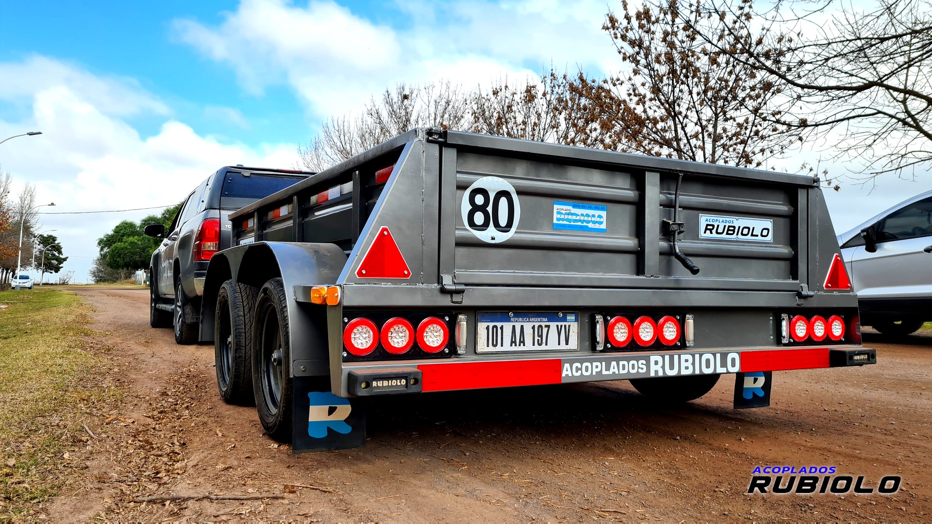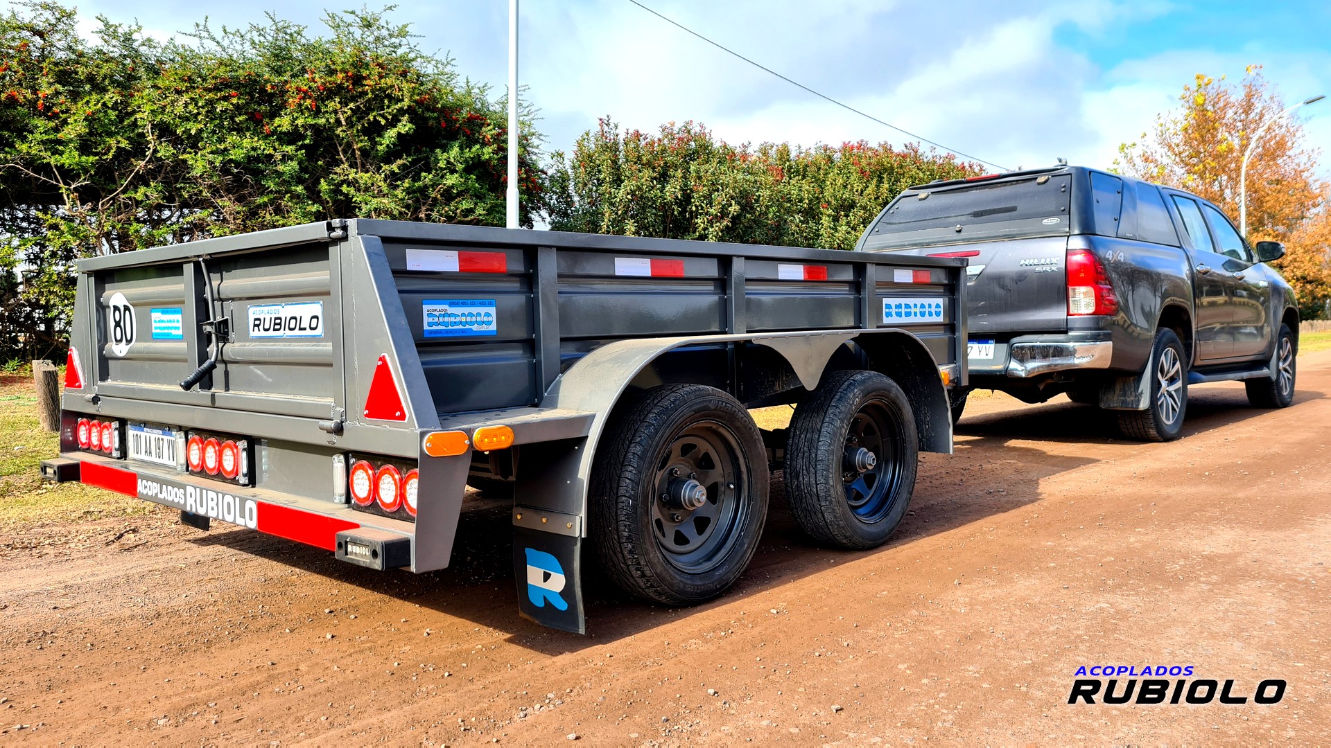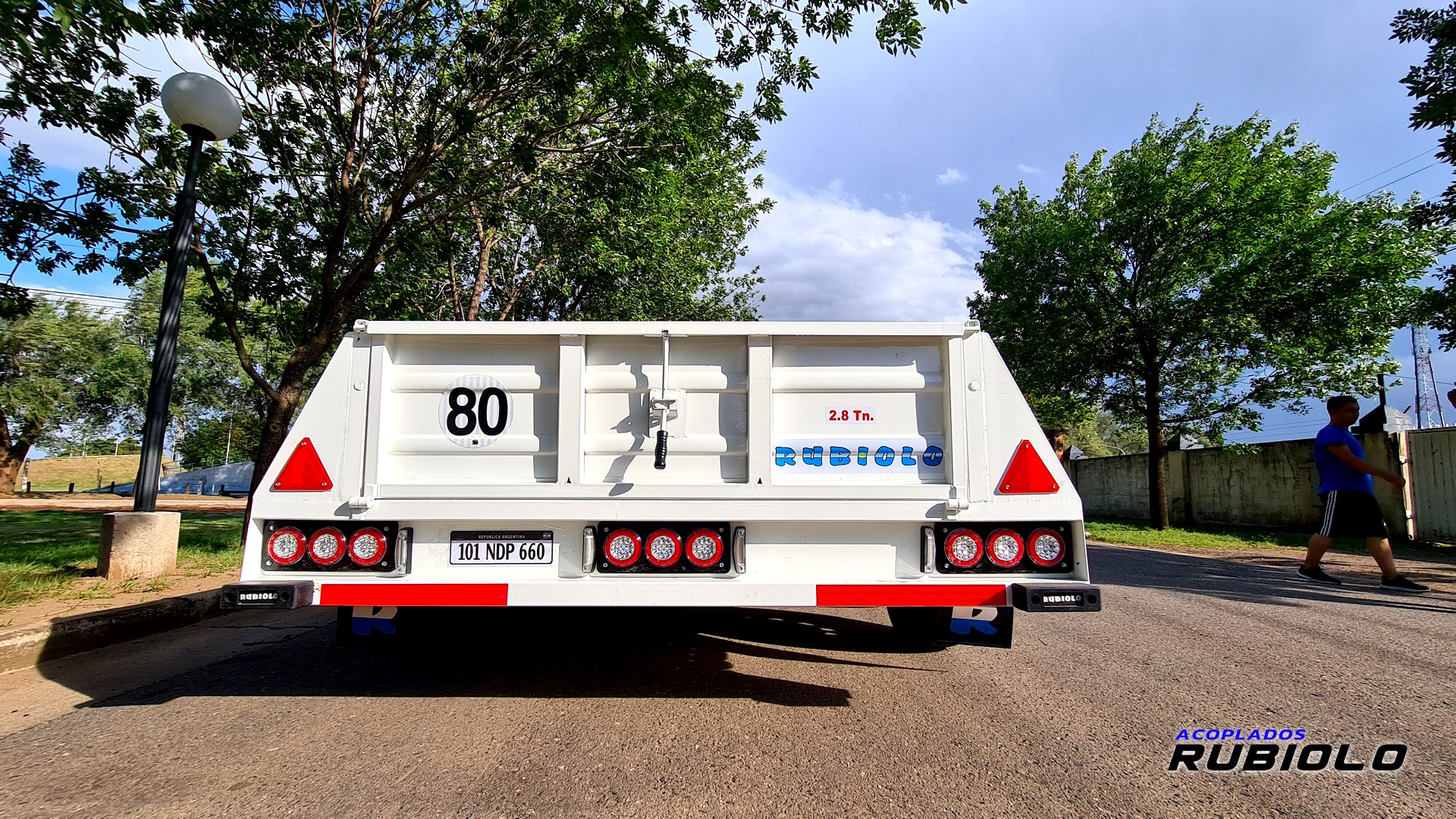 Acoplado de doble eje con sistema Balancín, Homologado para ruta (O2) y diseñado con ruedas al costado (tipo batán). Posee un sistema de freno eléctrico inercial completo y cumple con todas las normativas viales para una capacidad de carga real de 2.8 Tn.