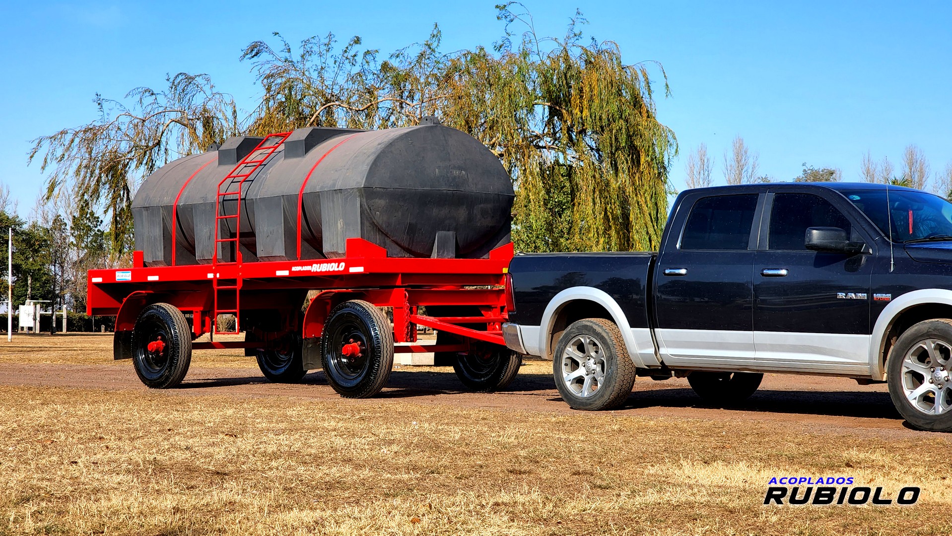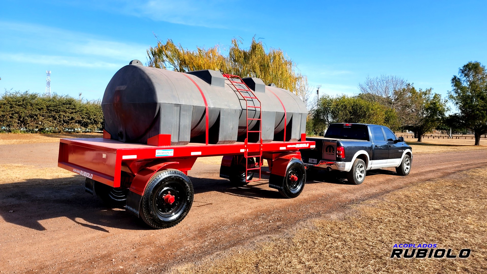 Acoplado de alta capacidad (6.000 Lts.) con tanque plástico y sistema Bantrén, diseñado específicamente para el apoyo logístico de agua en tareas de fumigación, incluyendo barandas para contención de bidones.