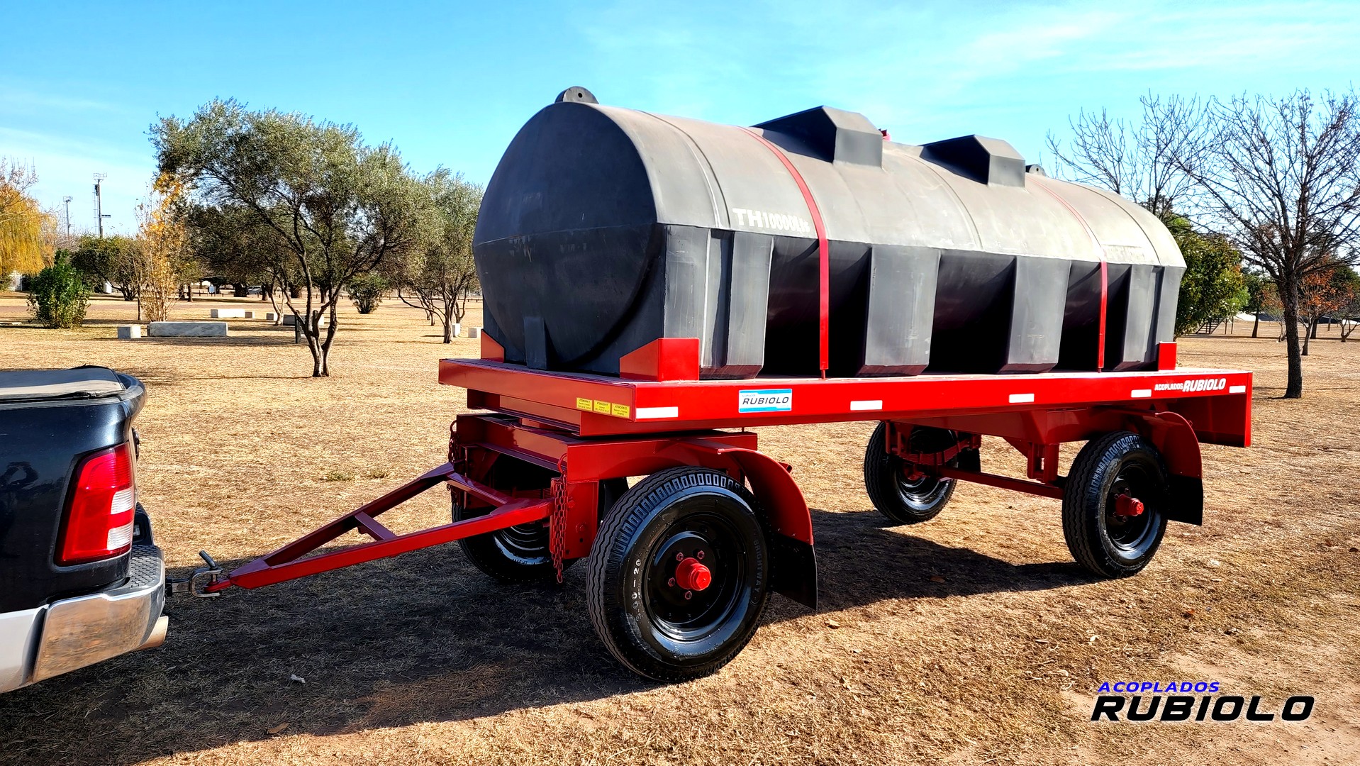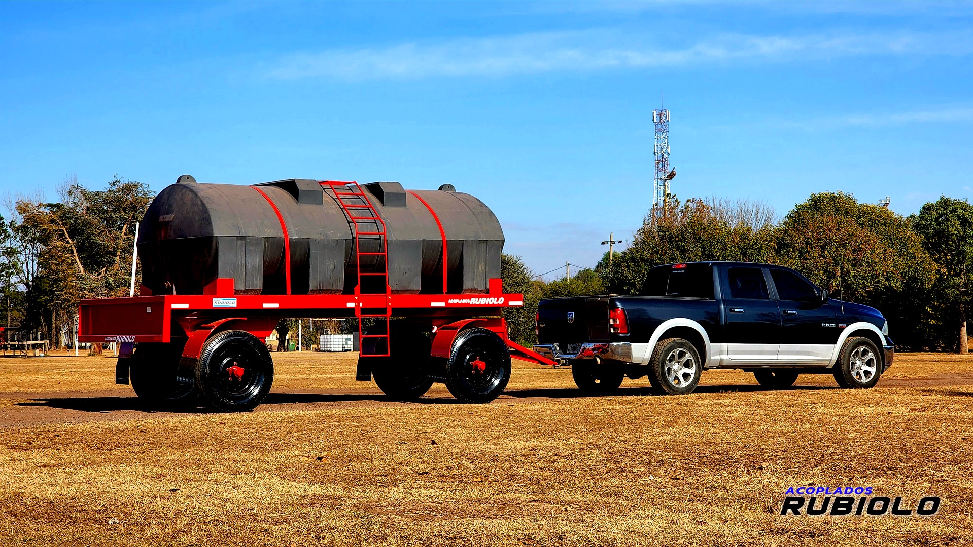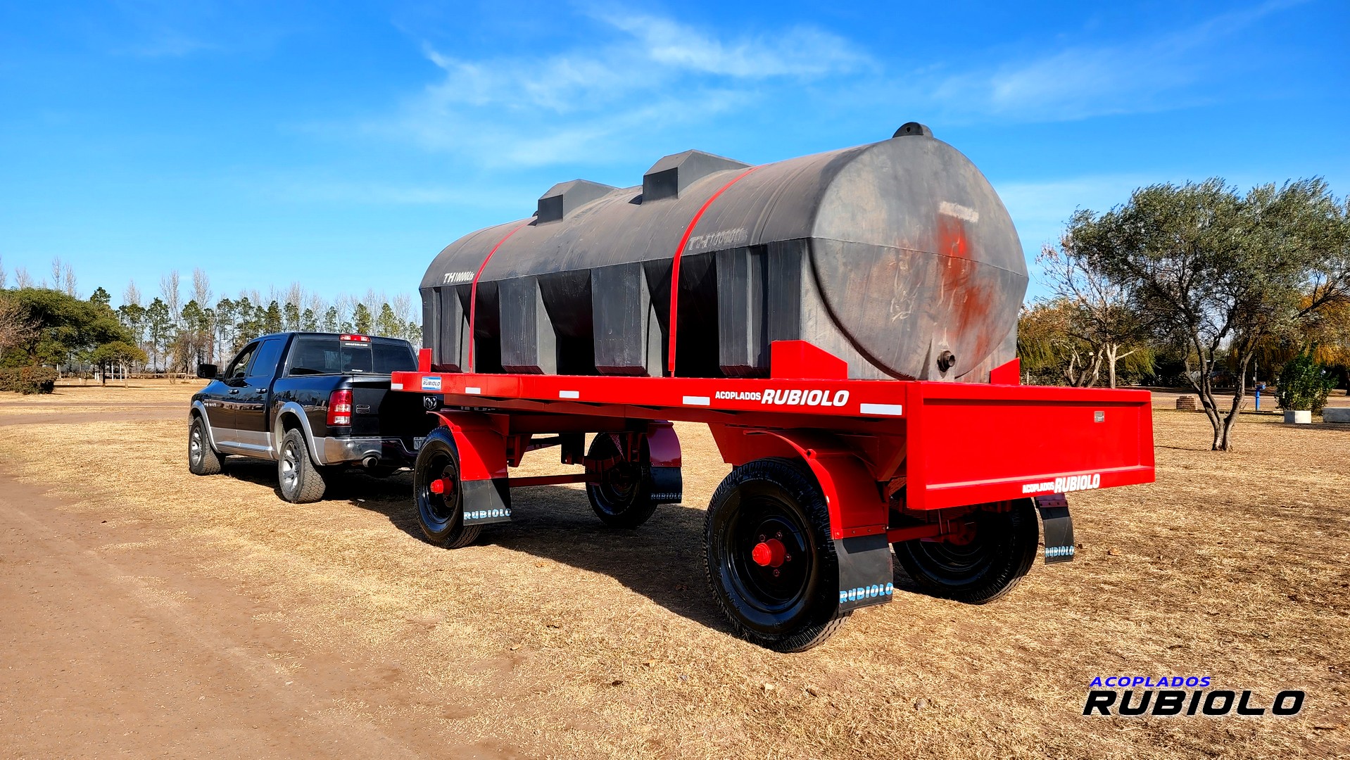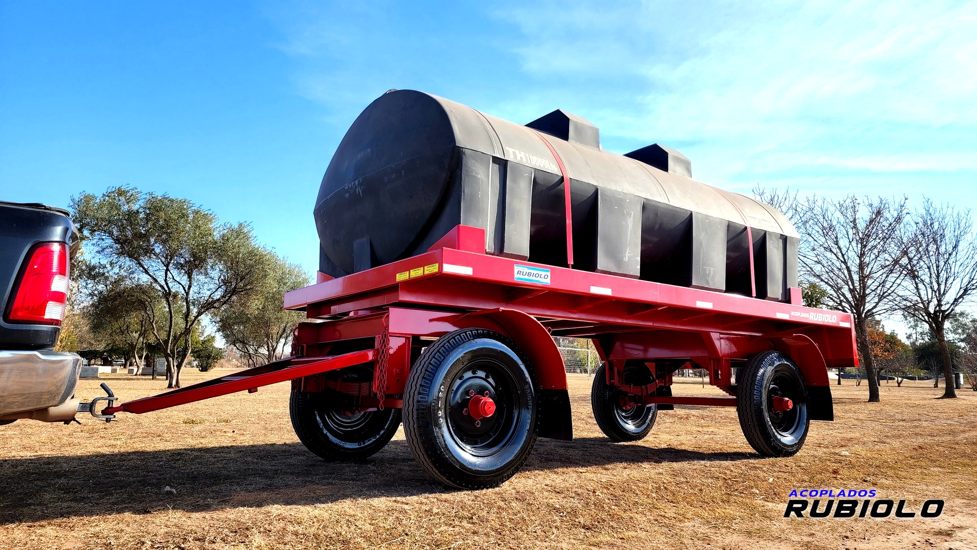 Acoplado de gran capacidad (8.000 Lts.) con tanque plástico, diseñado con ejes de 3″ y sistema Bantrén de gran diámetro para el soporte logístico de agua, incluyendo barandas para contención de bidones en operaciones de fumigación.
