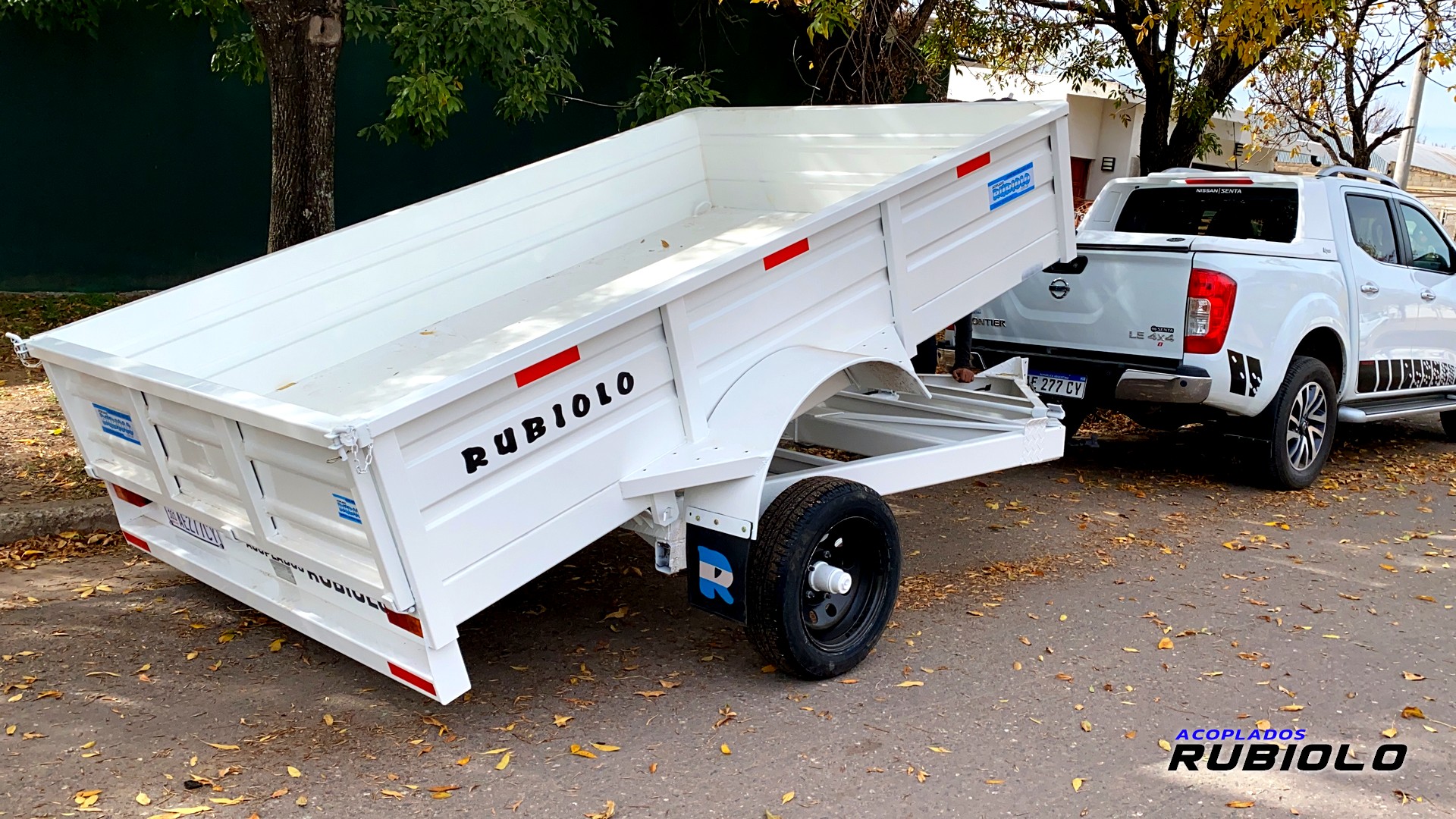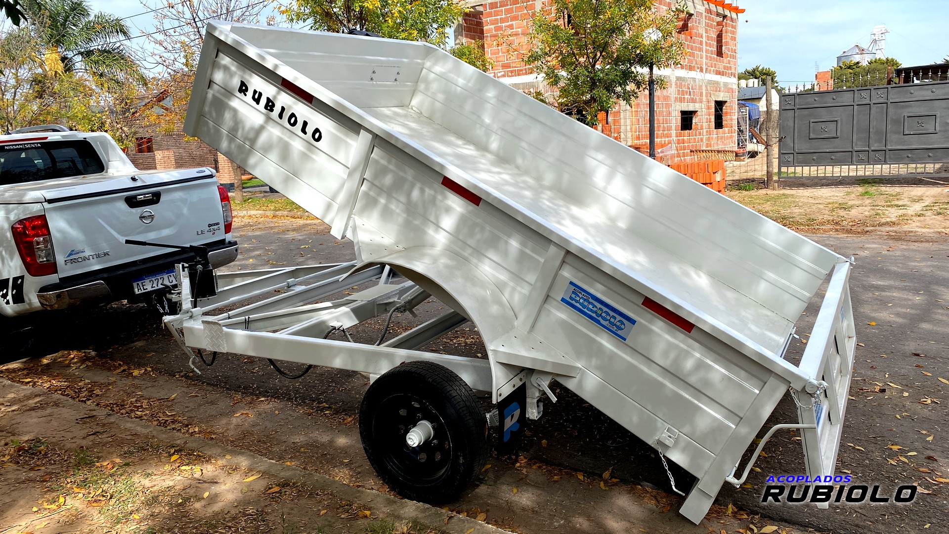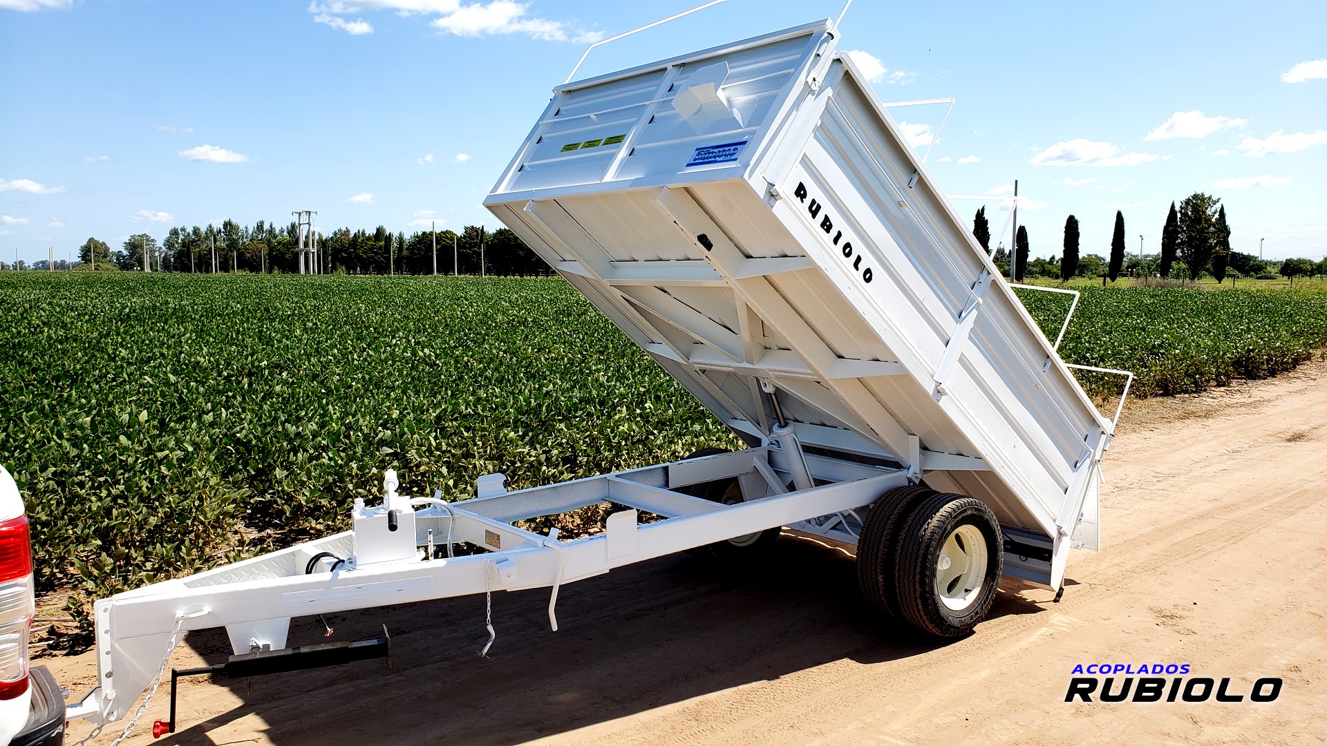 Acoplado Volcador trasero de eje simple (tipo Batán) con capacidad de 1.5 Toneladas y volumen de 2,85 metros cúbicos. El sistema de vuelco se acciona mediante un cilindro hidráulico, ideal para el transporte y descarga de materiales a granel.