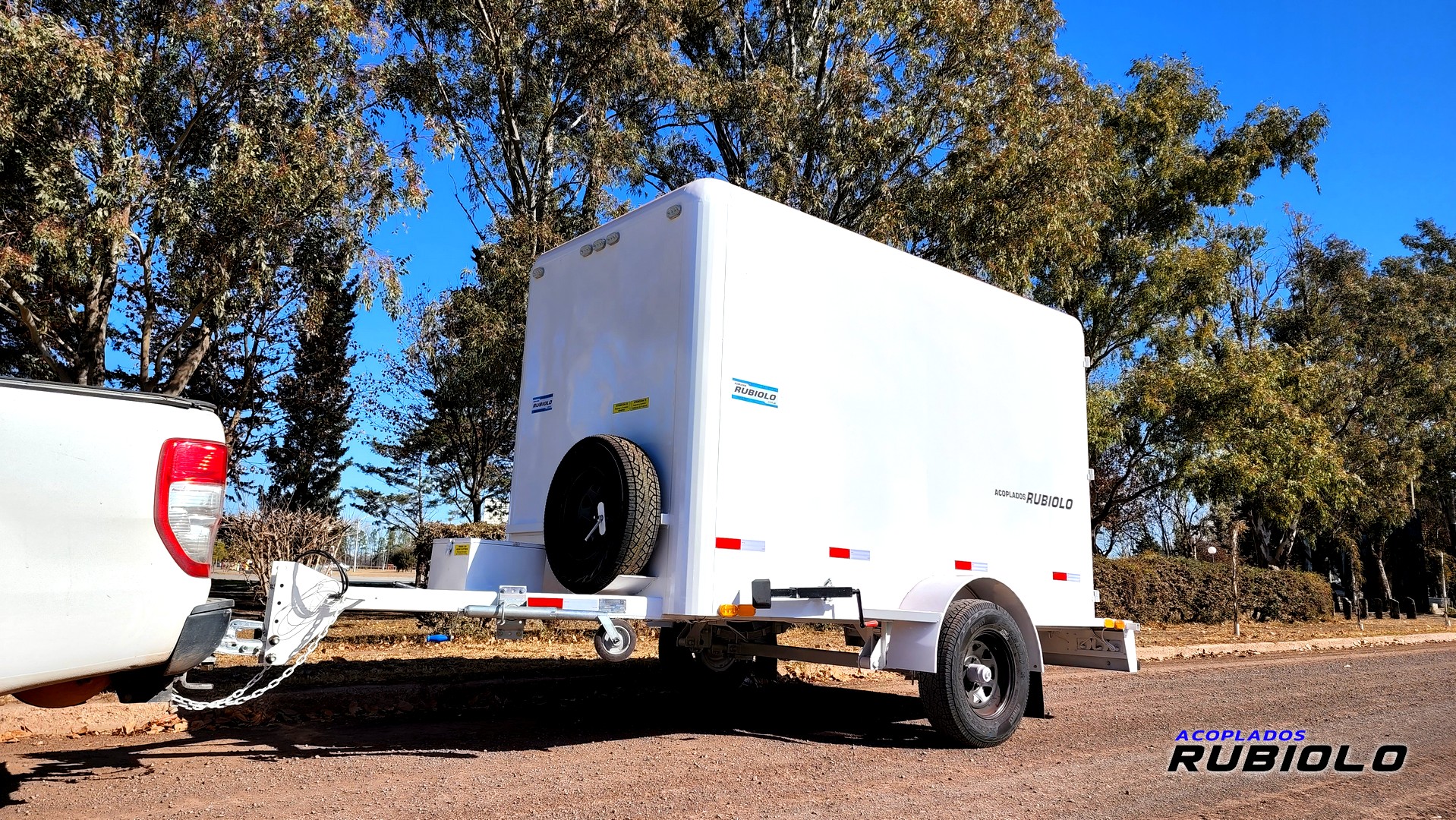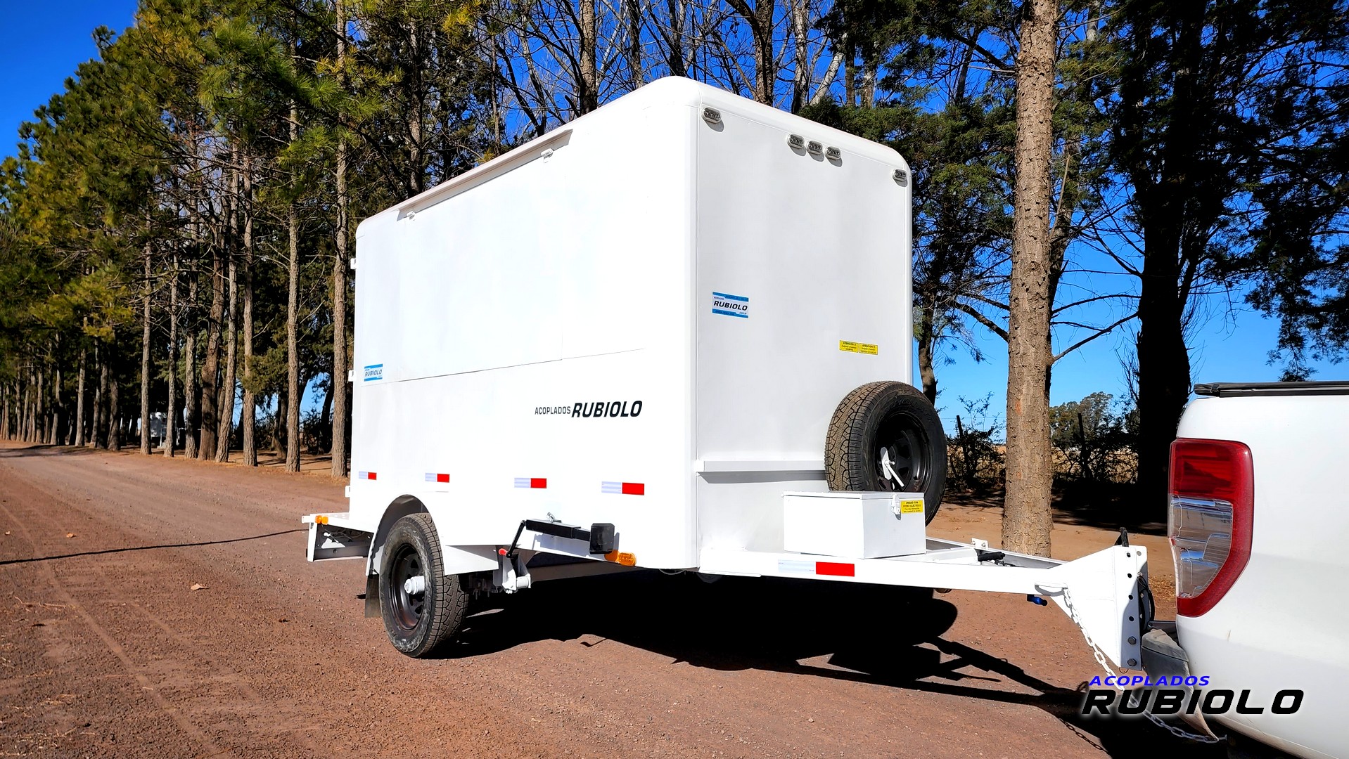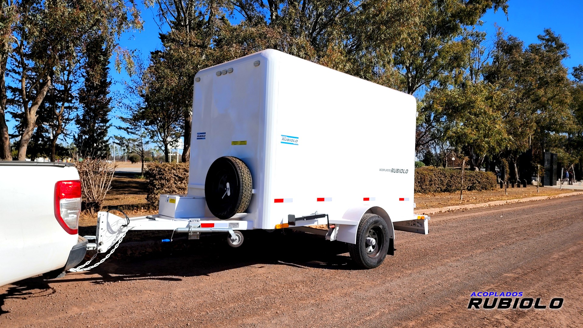 Acoplado carrozado y cerrado de diseño «Tipo Americano» con capacidad de 1.500 Kg., eje simple y altura de 2 Mts., ideal para el transporte de carga voluminosa o como unidad móvil compacta.