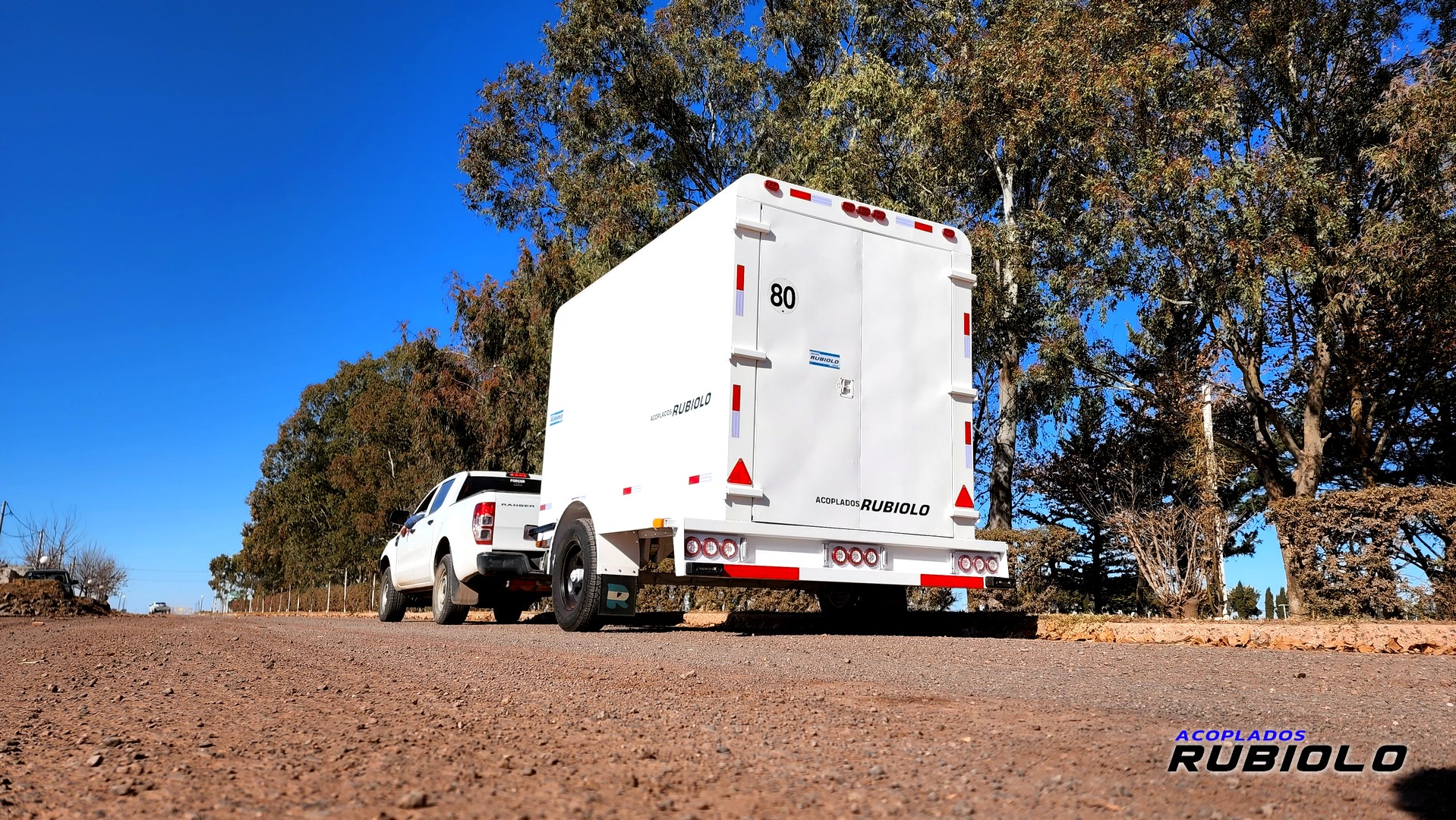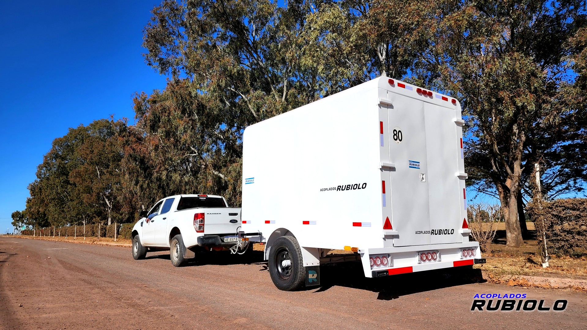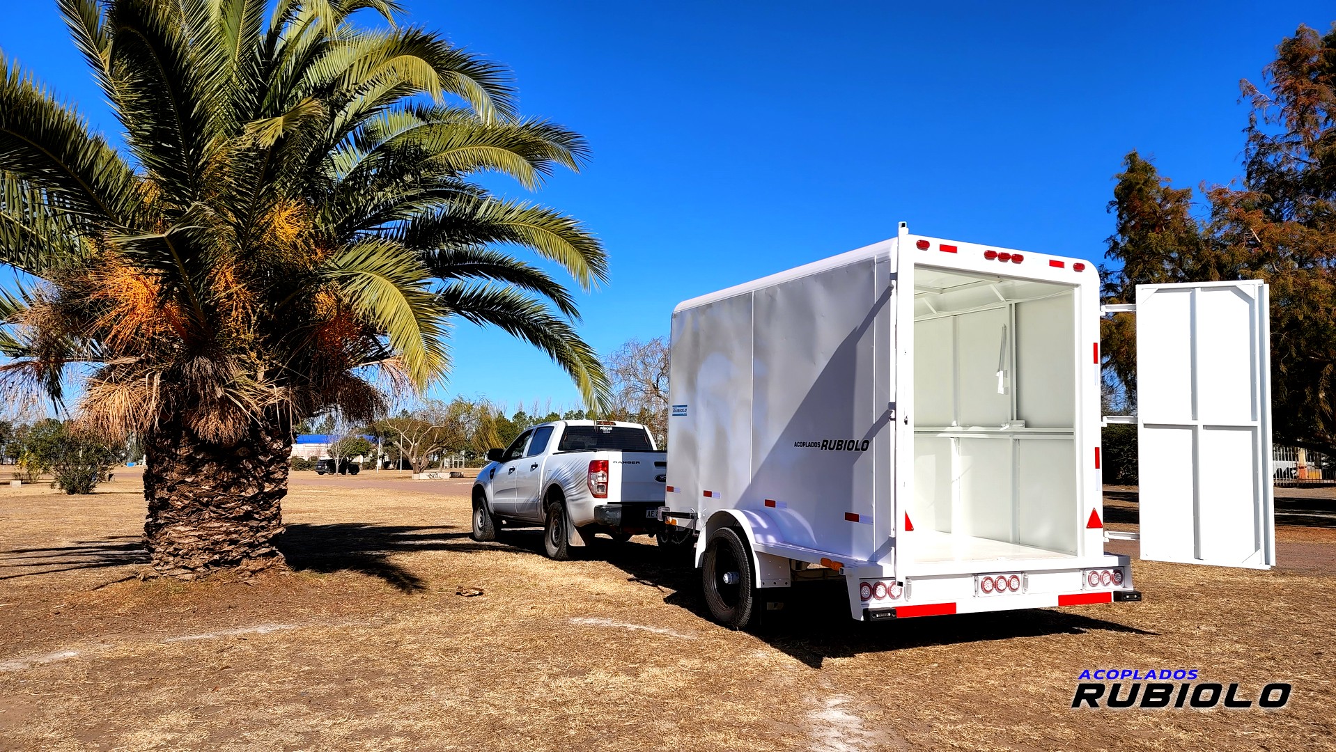 Acoplado carrozado y cerrado de diseño «Tipo Americano» con capacidad de 1.500 Kg., eje simple y altura de 2 Mts., ideal para el transporte de carga voluminosa o como unidad móvil compacta.
