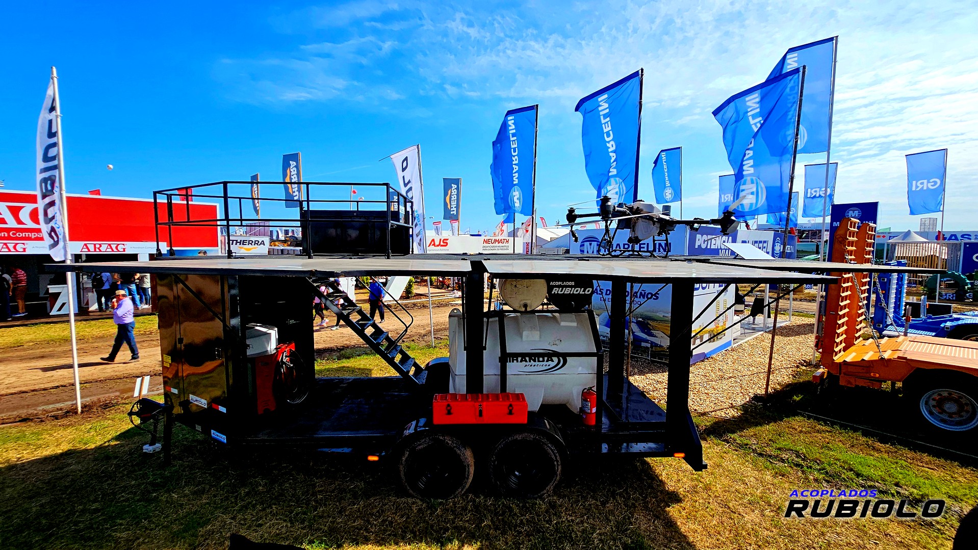 Unidad móvil carrozada de doble nivel, diseñada específicamente para la operación y soporte logístico de drones fumigadores, ofreciendo un amplio espacio de trabajo y seguridad.