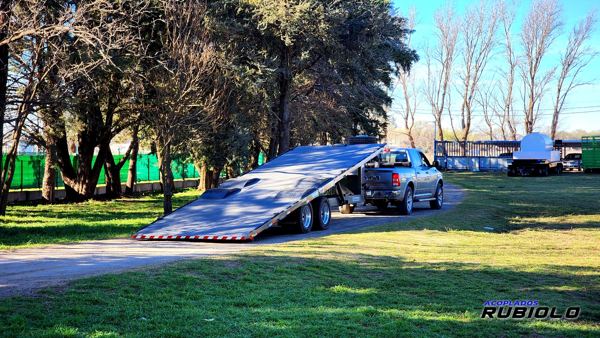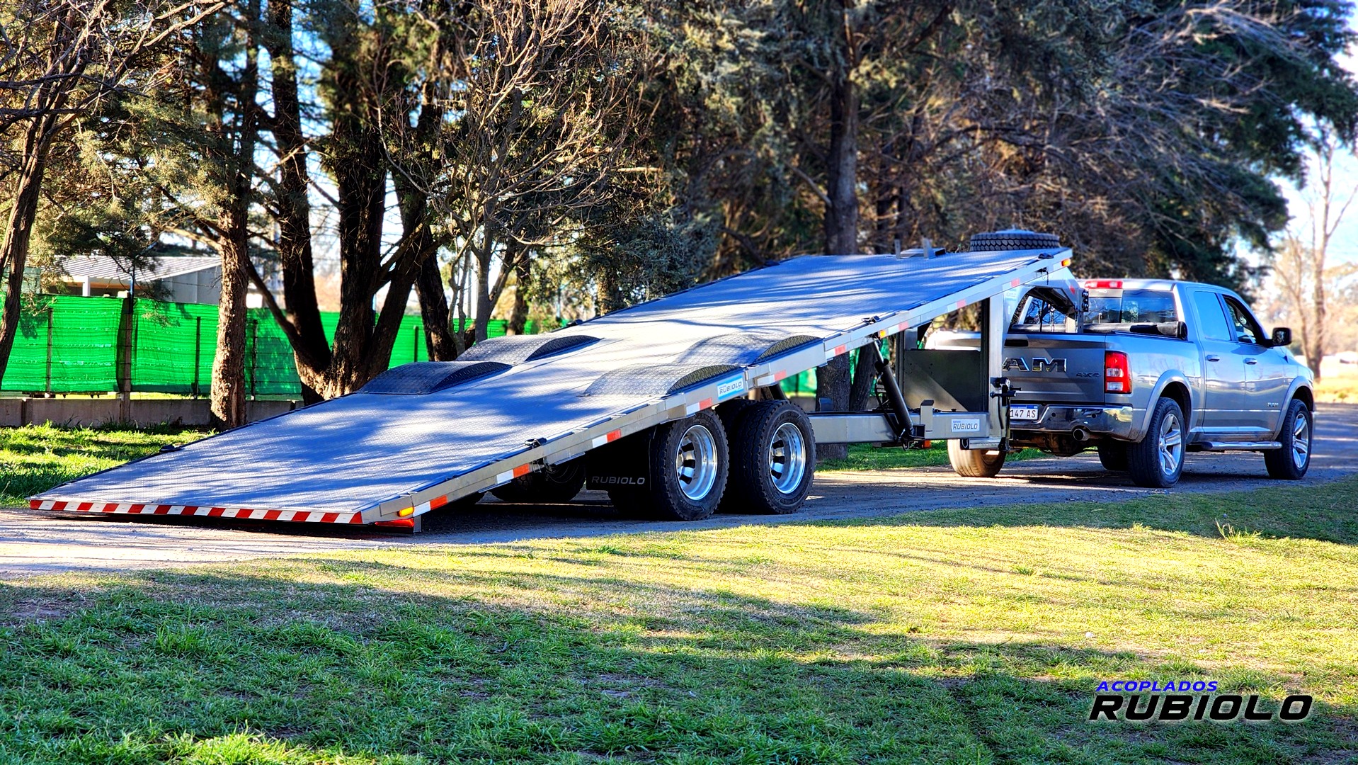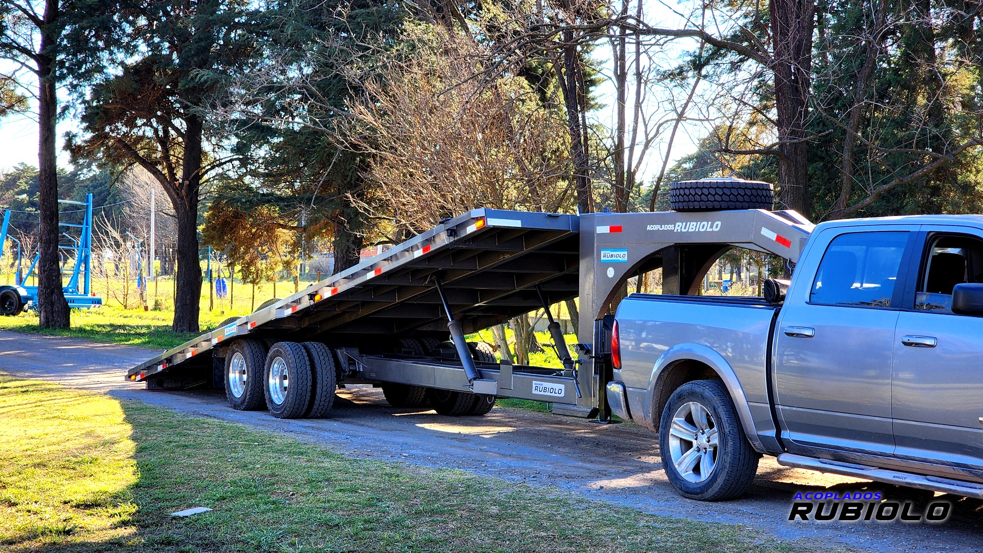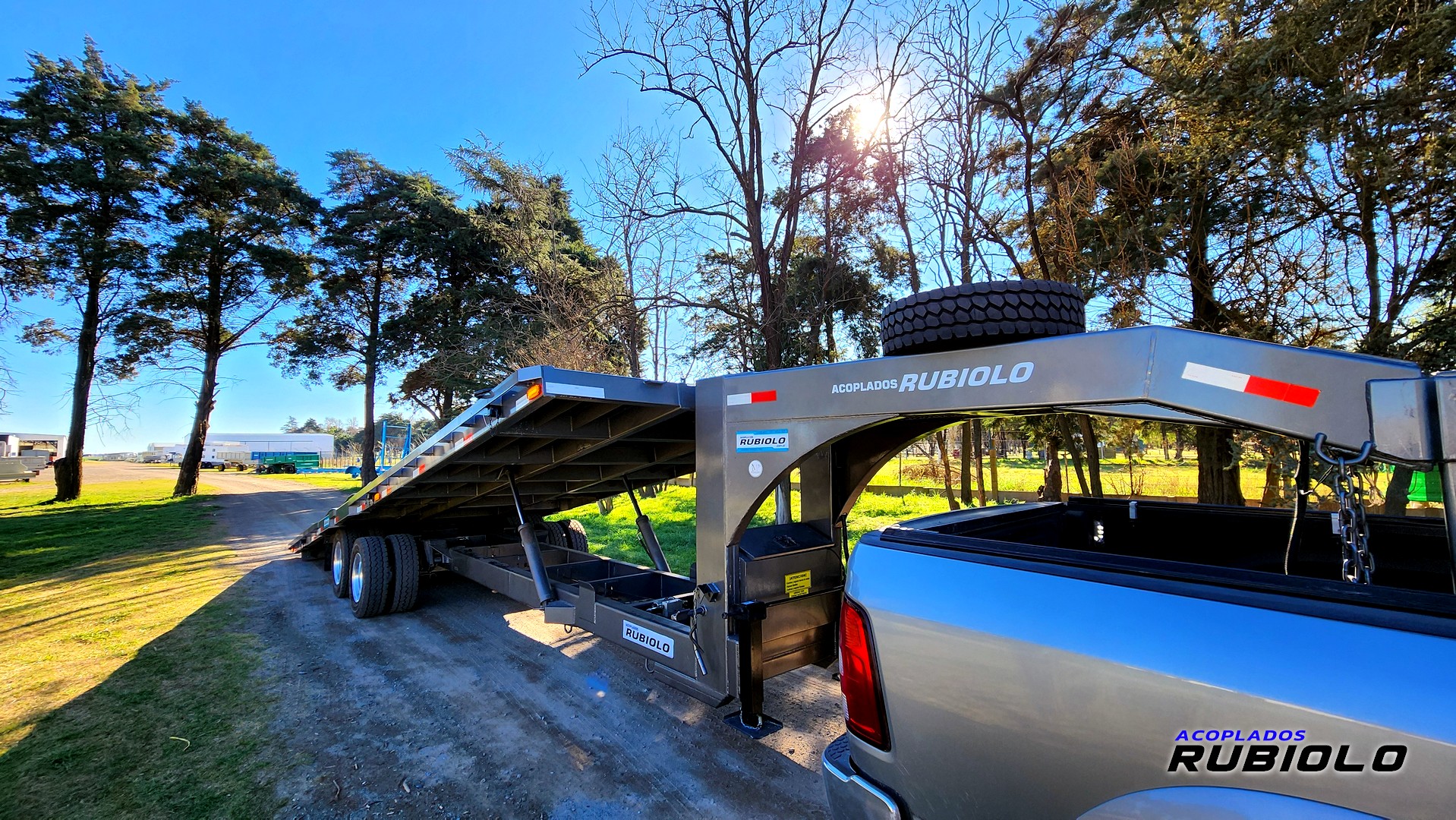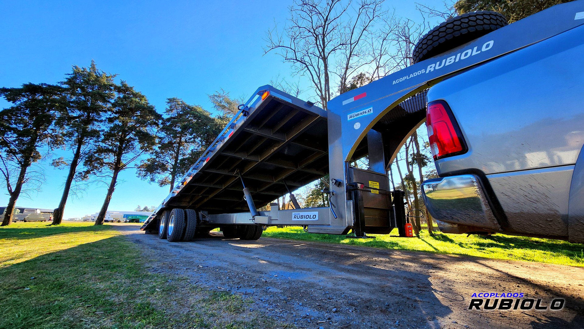 Semirremolque de gran capacidad con sistema de plataforma basculante hidr谩ulica, ideal para facilitar la carga y descarga de maquinaria pesada y equipos.
